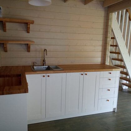 Krāsota finiera virtuve ar ozolkoka virsmu.
